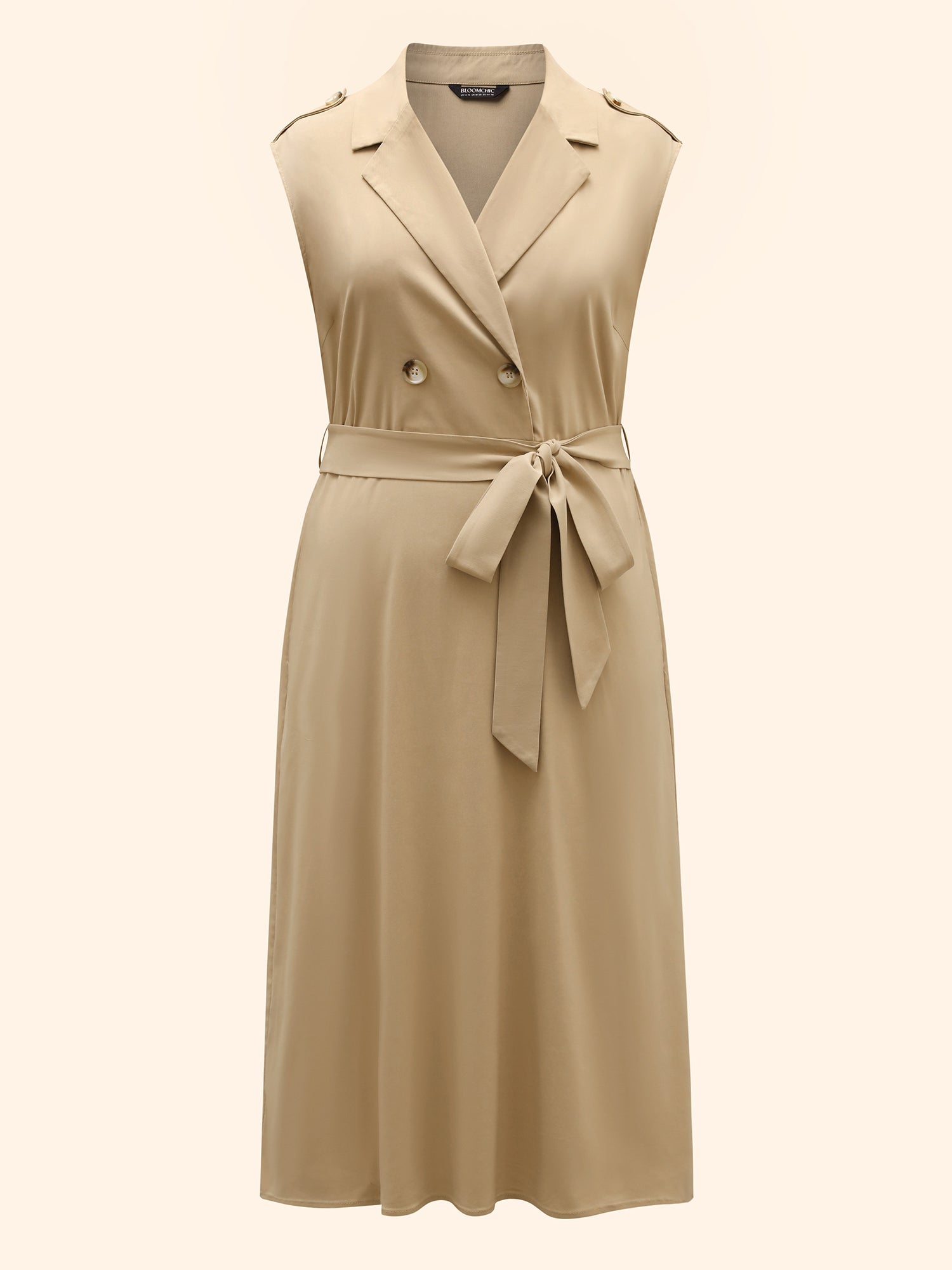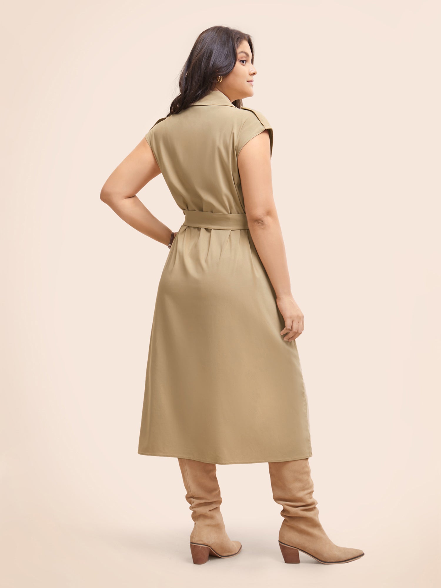 • Suit Collar Plain Belted Midi Dress