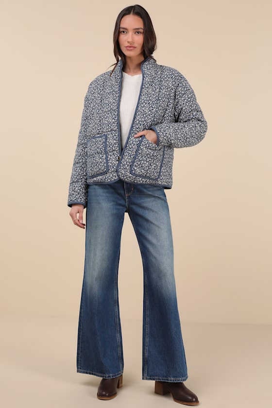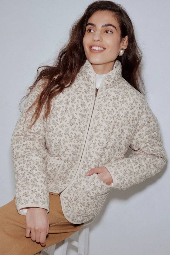 Leaving the house is so much easier when you have a cute piece like the Lulus Bundled Perfection Light Beige Floral Quilted Puffer Jacket! A ditsy floral print adorns soft woven fabric with a puffy, quilted design as it shapes a cozy mock-like neckline framed by long sleeves with drop shoulders. A functional zipper secures at the center of the wide-cut bodice, while twin patch pockets finish off the toasty warm look!