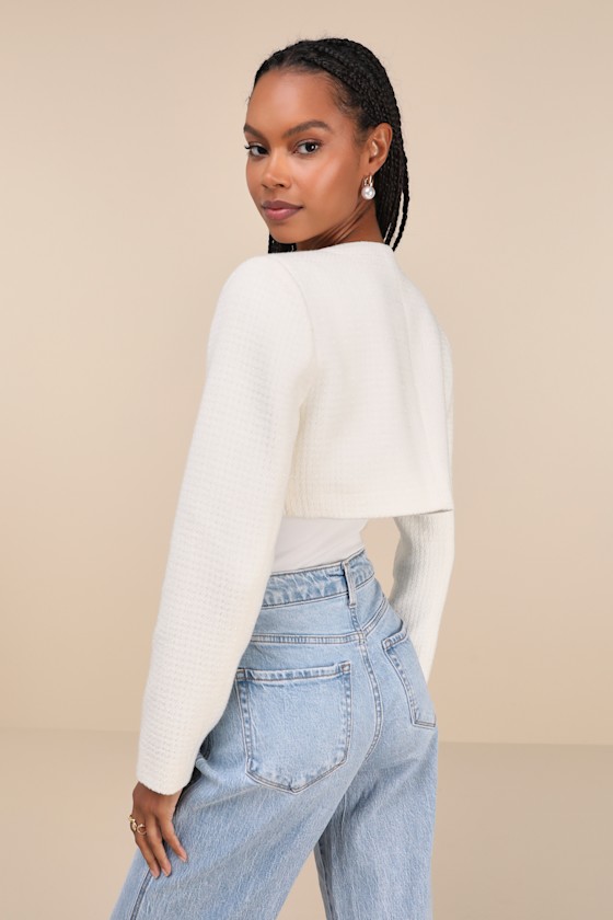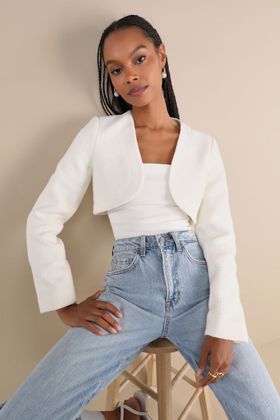 Pair a stunning gown or jumpsuit with the Lulus Compellingly Posh Ivory Tweed Lurex Cropped Bolero Jacket and you'll have an endlessly complimented look! Monotone woven tweed (with subtle, reflective tinsel-like threading throughout) shapes long sleeves with padded shoulders and an ultra-cropped, bolero-style bodice with an open front and rounded hems.