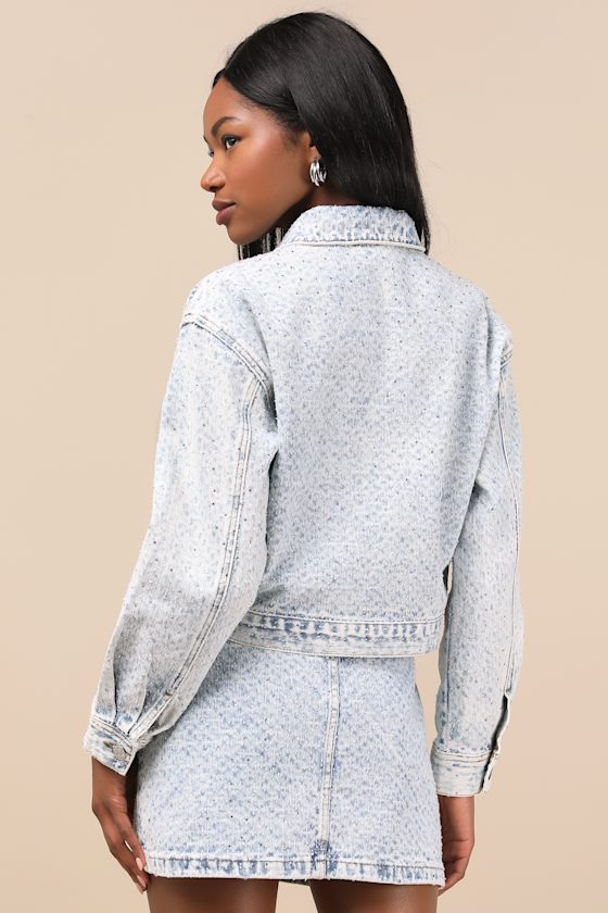With the Steve Madden Glacia Light Wash Rhinestone Zip-Front Denim Jacket, you can stay on trend this season and every season to come! Sturdy cotton denim shapes this cool jacket that boasts an acid wash-like design and rhinestone studs throughout as it shapes a collared neckline and long sleeves with drop shoulders and button cuffs. The relaxed-fit bodice boasts a silver zipper closure at the front, a functional patch pocket, and convenient welt pockets at the sides.