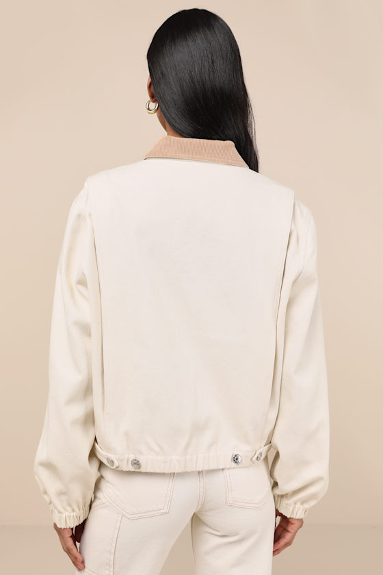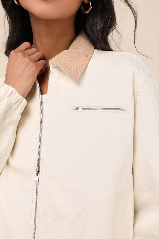 Coveted looks will always finish with the Lulus Haimi Cream Cotton Barn Jacket this season! Woven cotton shapes this lightweight jacket with a tan, corduroy collared neckline, framed by long, loose-fitting sleeves with elastic at the cuffs. The boxy, barn-style bodice features a silver zip-front closure and a cute zippered pocket, all before ending with an elasticized, cropped hem with adjustable, buttoning side cinches.