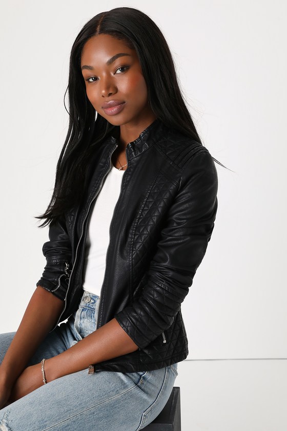 Follow your heart right to the Heartlines Black Vegan Leather Moto Jacket! Sleek vegan leather shapes this unique moto jacket with a collarless silhouette, and quilted detailing throughout. Shiny silver front zipper with matching zippered pockets and cuffs complete the look.