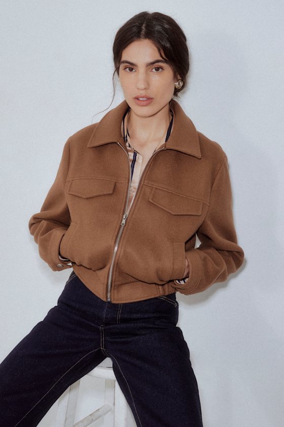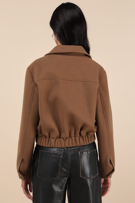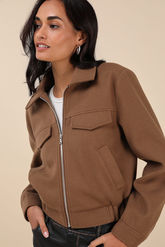 The ultimate cozy (and stylish) look must include the Lulus Top-Notch Comfort Beige Collared Bomber Jacket! Brushed, wool-like woven fabric shapes this trendy jacket that features a collared neckline and long sleeves with button cuffs. The bomber-style silhouette boasts a silver zipper along the center, decorative flap pockets, and functional welt pockets at the sides. Slightly cropped elasticized hem completes the look.